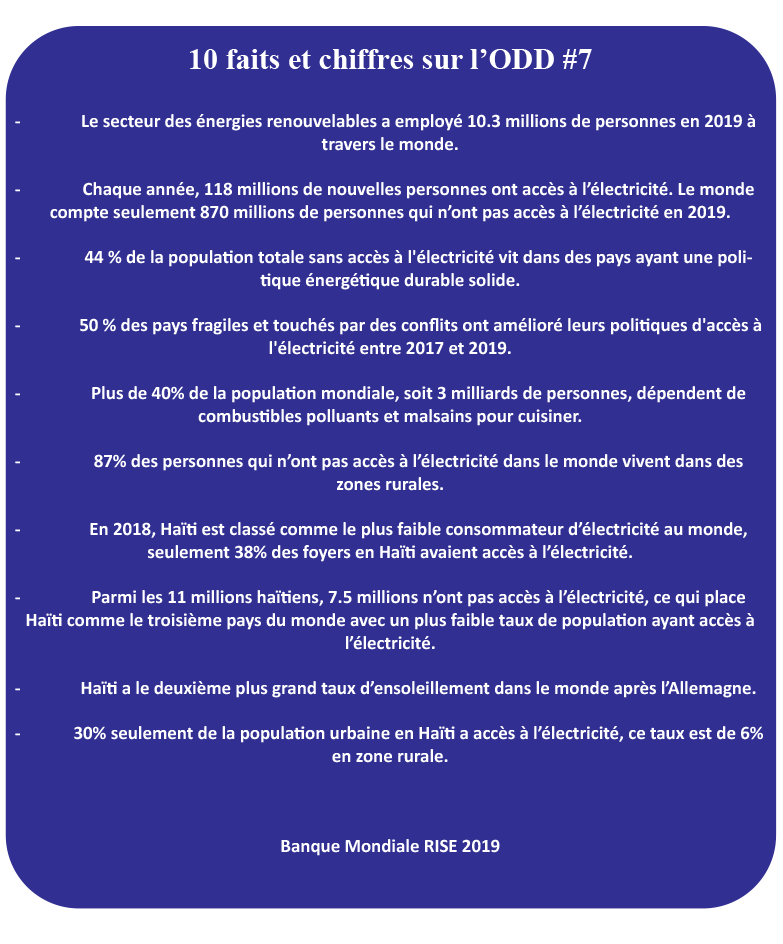-Parmi les 11 millions haïtiens, 7.5 millions n’ont pas accès à l’électricité, ce qui place Haïti comme le troisième pays du monde avec un plus faible taux de population ayant accès à l’électricité.