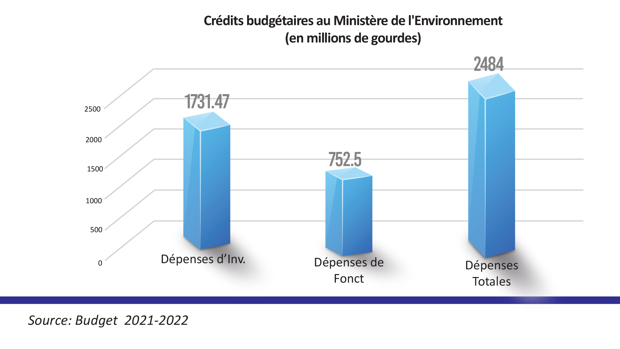 Dans le budget en cours d’exécution, l’environnement est relégué au second plan. En effet, seule- ment 1.2% de l’enveloppe total du budget 2021-2022 est alloué au ministère de l’Environnement (MDE). Le budget du MDE est de 2.85 milliards de gourdes (MG), sur un budget total de 210.6 MG. Seulement 752 550 000 gourdes, soit 30.29% du budget du MDE, sont allouées au poste de l’investissement tandis que 1.74 MG est 69.71% sont alloués au poste de l’investissement. L’environnement reste peu valorisé dans le choix public haïtien pendant que le pays fait face à d’énormes défis environnementaux qui font obstacles à son développement.