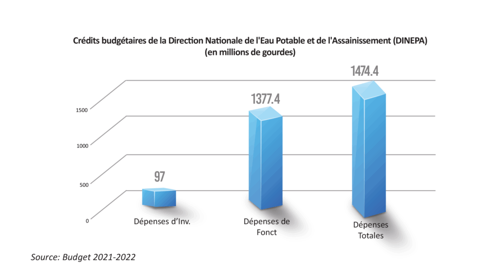 Nous ne pouvons pas parler de l’environnement sans mentionner l’eau potable et l’assainissement. Ces deux postes sont très dépendants d’un environnement sain quand nous savons que leurs approches de gestion y sont totalement intégrées. Dans le budget l’eau et l’assainissement disposent d’un budget de 1.75 MG soit 0.7% du budget. Les dépenses d’investissement représentent 93.4% du budget de la Direction Nationale de l’Eau Potable et de l’Assainissement (DINEPA) tandis que les dépenses de fonctionnement comptent pour 6.6%.