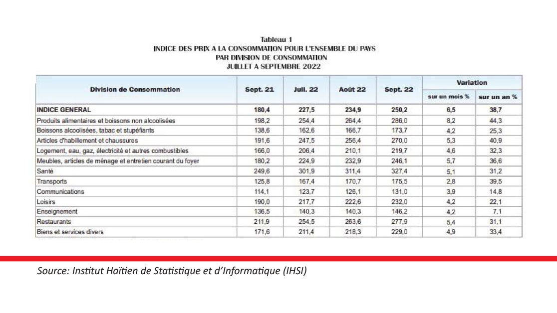 soit 250.2 contre 234.9 en août. Il en résulte une augmentation mensuelle de 6,5% et une inflation annualisée de 38,7%, a constaté l’Institut haïtien de statistique et d’informatique (IHSI) dans la dernière publication de sa rubrique mensuelle intitulée « Le coin de l’IPC ».