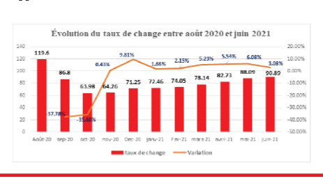 Toutefois, ce regain de force de la monnaie nationale n’a pas suivi une tendance durable. Au second trimestre de l’exercice fiscal 2020-2021, la gourde est repartie à la baisse. En effet, depuis novembre 2020, il est constaté une variation mensuelle positive du taux de change de la gourde par rapport au dollar, avec parfois des pics supérieurs à 6%. Entre octobre 2020 et juin 2021, la gourde est passée de 63.98 à 90.89 pour un dollar soit une chute de 42.06%.