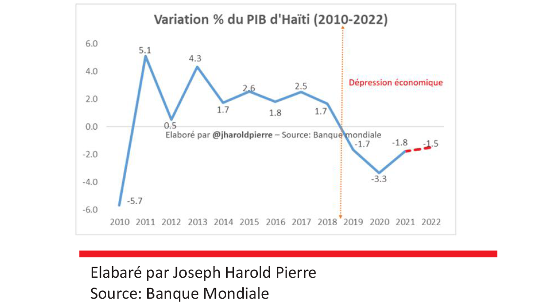 Le blocage du terminal de Varreux entre le 12 septembre et le 7 novembre de cette année rappelle les événements des 6 et 7 juillet 2018, car ils sont tous deux causés par l’annonce d’augmentation des prix des carburants. Ces deux épisodes, tout comme l’assassinat du Président Moïse, mettent en évidence l’effondrement de l’Etat, sa totale dysfonctionnalité, son inexistence même. Si la variation du PIB d’Haïti a été très volatile en 2010 et 2017 en épousant la forme d’un zigzag avec une tendance à la baisse, elle n’a jamais été négative. Cependant, il semble que les événements de juillet 2018 avaient annoncé la dépression qu’expérimente l’économie du pays, entendons par là une croissance négative de plus de trois ans. En effet, les pillages de 2018 ont été suivi de longues périodes de manifestations entre 2019 et 2022 auxquelles s’est ajoutée l’insécurité comme étant deux facteurs ayant totalement paralysé les activités économiques. Il en résulte une période de croissance négative continue entre 2019 et 2021. En toute évidence, l’année 2022 sera aussi une année perdue comme les trois antérieures, car le pays a été totalement bloqué, spécialement entre septembre et novembre. La prévision de la Banque mondiale pour l’économie d’Haïti est une croissance négative de 1.5%.