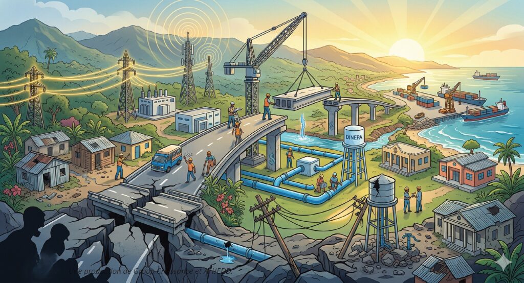 Haïti fait face à une crise sécuritaire sans précédent qui a sévèrement affecté ses infrastructures économiques et sociales, accentuant ses vulnérabilités face aux catastrophes naturelles et aux changements climatiques. D’après le Rapport d’Évaluation Rapide de l’Impact et des Besoins de Redressement (ERIC), les dommages se chiffrent à plusieurs centaines de millions de dollars, impactant les transports, l’électricité, l’eau potable, les télécommunications, le logement et les bâtiments publics. Avec des besoins de relèvement estimés à 444 millions de dollars pour 2024-2026 et plus de 1,85 milliard pour 2026-2030, la reconstruction s’annonce comme un défi herculéen.