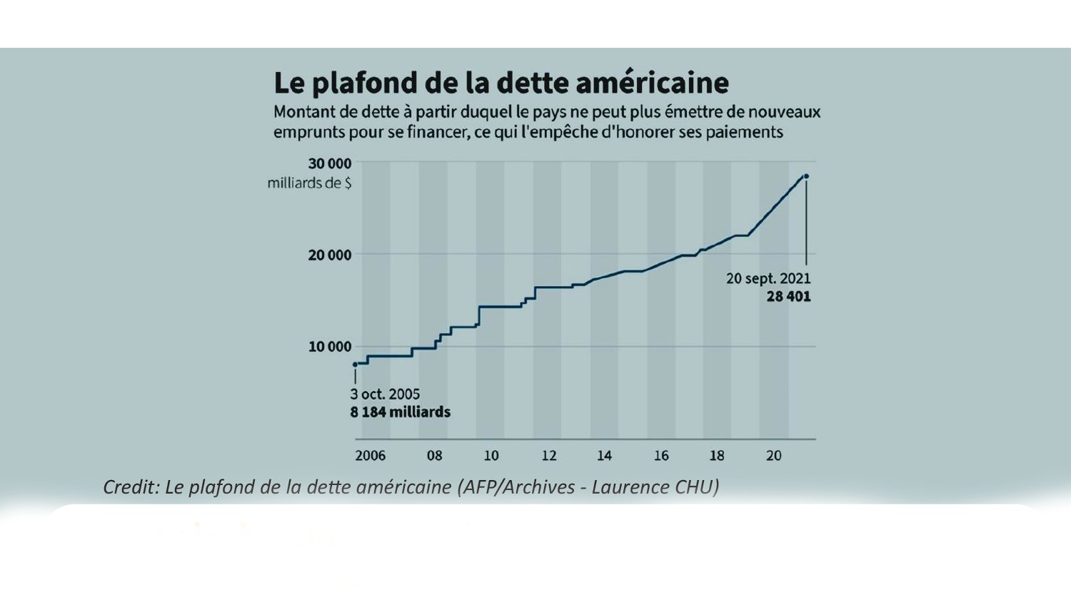Les États-Unis ont atteint leur plafond d’endettement le jeudi 19 janvier 2023, soit le niveau maximum de ce qu’ils peuvent emprunter pour faire fonctionner le pays. Ce plafond est de 31 000 milliards de dollars. La limite étant dépassée, le Trésor américain ne peut plus emprunter, même à court terme, pour des besoins de fonds de roulement. Il existe pour l’heure une période de suspension d’émission de dette qui durera jusqu’au 5 juin.