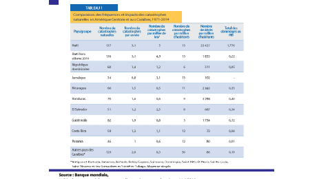 Haïti est un des pays du monde les plus exposés aux catastrophes naturelles — ouragans, inondations et séismes. De tous les pays des Caraïbes, Haïti est celui qui subit le plus grand nombre de catastrophes par kilomètre carré (tableau 1.1). En 2008, les tempêtes tropicales et les ouragans ont entraîné dans ce pays des pertes évaluées à 15 % du PIB. Le séisme du 12 janvier 2010 a entraîné la mort de 220 000 personnes, forcé le déplacement de 1,5 million de personnes, et provoqué des destructions d’une valeur équivalant à 120 % du PIB.