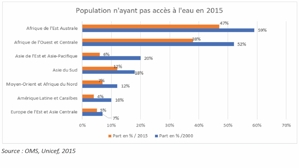 Tenant compte des différentes régions du monde, de grandes évolutions ont été constatées entre 2000 et 2015 dans les régions de l’Asie de l’Est et AsiePacifique où le pourcentage de personnes n’ayant pas accès à l’eau est passé de 20% à 6%. L’Afrique Subsaharienne pour sa part n’a connu qu’une amélioration relative. Dans l’Est et le Sud de l’Afrique, la part des habitants n’ayant pas accès à l’eau est passée de 59% en 2000 à 47% en 2015. Donc la région fait toujours face à un problème sérieux d’accès à l’eau. Dans le graphique suivant, nous avons l’évolution de la situation des différentes régions du monde en termes d’accès à l’eau. Le continent africain, plus particulièrement dans sa partie d’Est Australe, est la région qui fait face le plus au problème d’accès à l’eau.