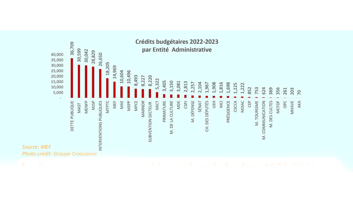 Pour l’exercice fiscal 2022-2023, la dette publique est de 36.7 milliards de gourdes soit 13.74% du budget. C’est le poste dont l’incidence budgétaire est la plus profonde. Une simple comparaison avec le secteur éducatif, médical et agricole peut démontrer davantage le fardeau de la dette publique dans le budget 2022-2023. En effet, la dette publique fait le triple des crédits budgétaires alloués à la santé (3.9%), elle surpasse de 2.5 points de pourcentage l’éducation (11.2%) et représente le quadruple de l’agriculture (3.1%).