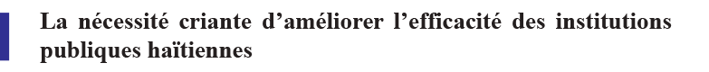 Dans ce contexte actuel de déficit de moyens et de capacités, le renforcement institutionnel qu’apporte le PReGePAPS pourrait être déterminant. Au terme du projet, le MARNDR, par exemple, vise à améliorer la prestation de ses services à travers l’encadrement des et l’amélioration de la production agricole dans le Sud-Est via le renforcement des Bureaux agricoles de communaux (BAC), la formation et l’appui technique aux agriculteurs, les subventions octroyées, et le système de statistiques agricoles. Le MTPCT projette de renforcer la surveillance des réseaux routiers ainsi que le Fonds d’entretien routier (FER) pour une meilleure durabilité des routes. Le projet appuie également la Cour Supérieure des comptes et du contentieux réussite administratif avec pour objectif d’améliorer la reddition des comptes par cette institution indépendante.