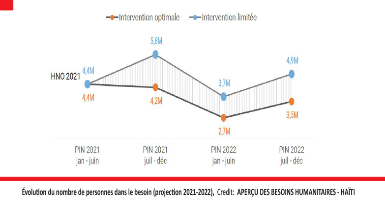 Haïti devrait expérimenter une augmentation de l’insécurité alimentaire à cause de la détérioration des conditions macro-économiques, aggravée par la montée des troubles sociopolitiques et le potentiel de précipitations inférieures à la moyenne conduisant à une mauvaise récolte agricole. En somme, 1,2 million de personnes devraient faire face à l’urgence (Phase 4 de l’IPC) entre mars et juin 2021.