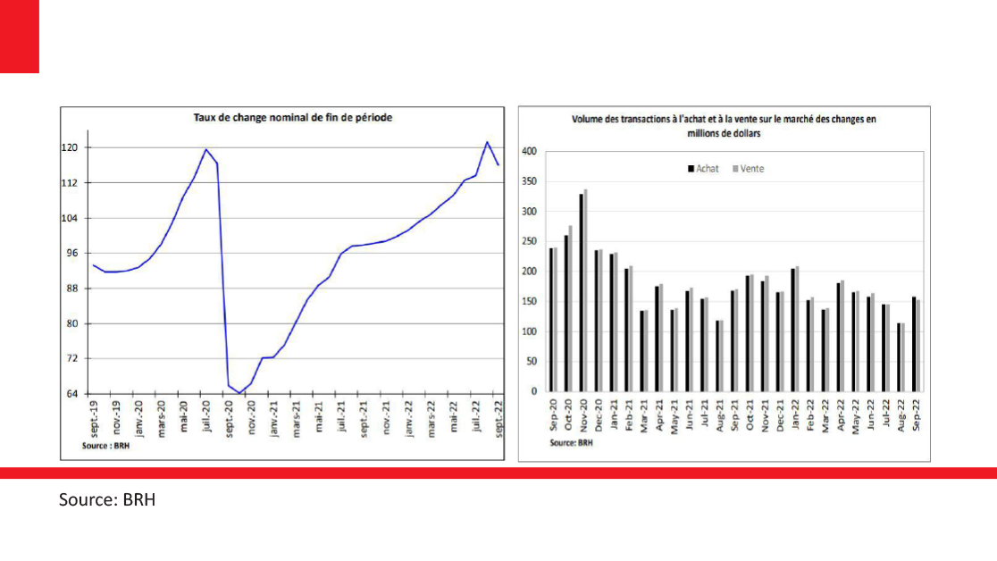 Les interventions précitées se sont soldées par une vente nette de 11,48 millions de dollars et la BRH a pu stériliser plus de 1,34 milliard de gourdes sur l’ensemble du trimestre sous revue. Par ailleurs, en vue de limiter la progression de la demande d’en- caisses de précaution en devises, la Banque centrale a poursuivi ses émissions d’obligations BRH dont l’encours s’est chiffré à 5,58 milliards de gourdes en septembre 2022 contre 7,3 milliards de gourdes en juin 2022.
