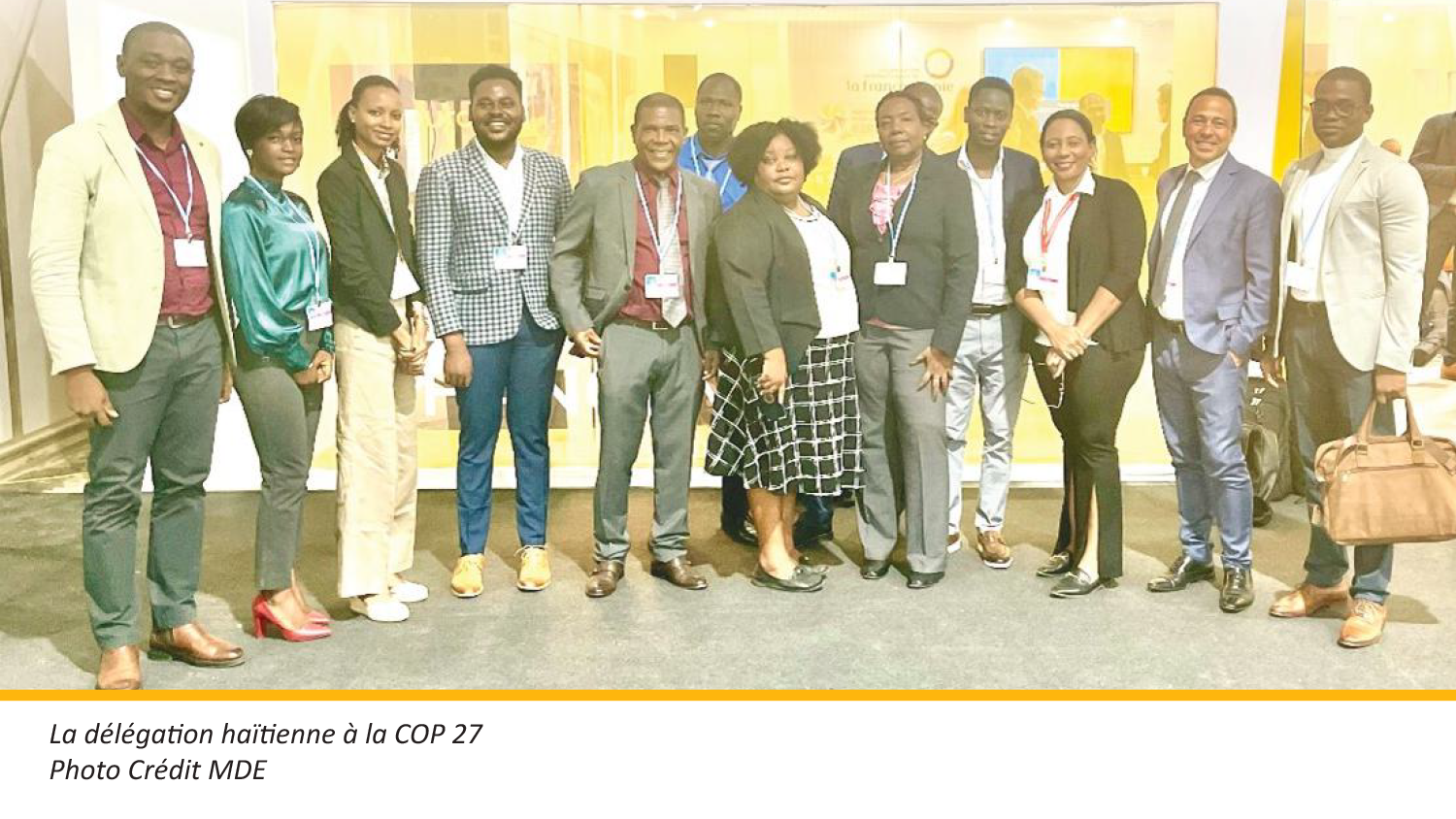 «La délégation haïtienne est composée de cadres du ministère de l’Environnement (MDE), de cadres de la Direction des changements climatiques, de membres de la société civile tels qu’ACCLEDD [Action pour le Climat, l’Environnement et le Développement durable], d’un représentant des jeunes qui luttent contre les changements climatiques en Haïti, d’agences internationales comme le PNUE et l’UNESCO. Tous font partie de la délégation haïtienne», a informé la directrice de la Direction des changements climatiques (DCC) du ministère de l’Environnement (MDE), Gerty Pierre, à la tête de la délégation haïtienne depuis le début de la COP 27.