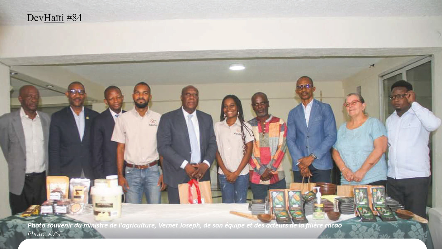 Vernet, a remercié tous les acteurs ayant contribué à l’élaboration du document Cadre stratégique pour le développement et la gouvernance de ka chaine de valeur du cacao haïtien, en l’occurrence Group Croissance, Agronomes et Vétérinaires sans frontières (AVSF) et des professionnels du ministère de l’Agriculture, des Ressources naturelles et du Développement rural (MARNDR) d’avancer quelques chiffres sur la filière cacao.